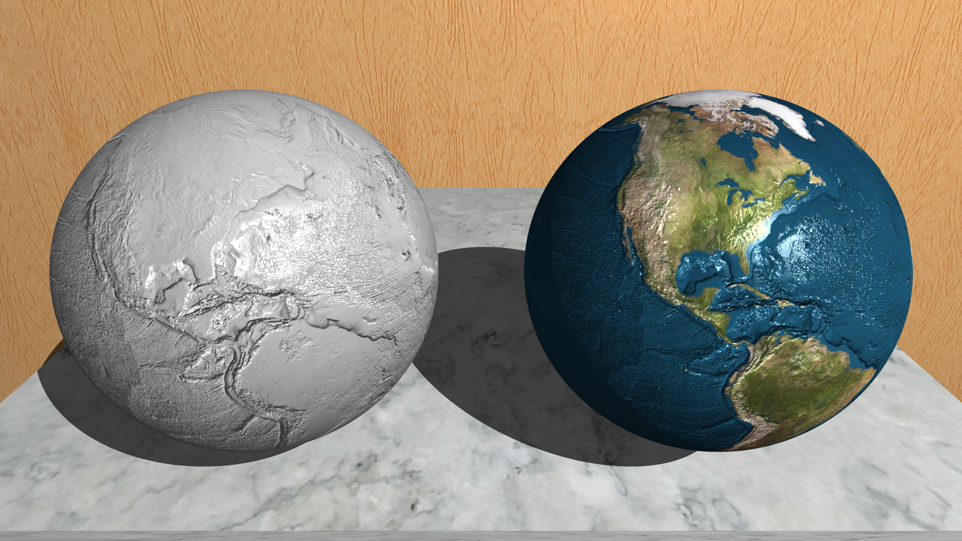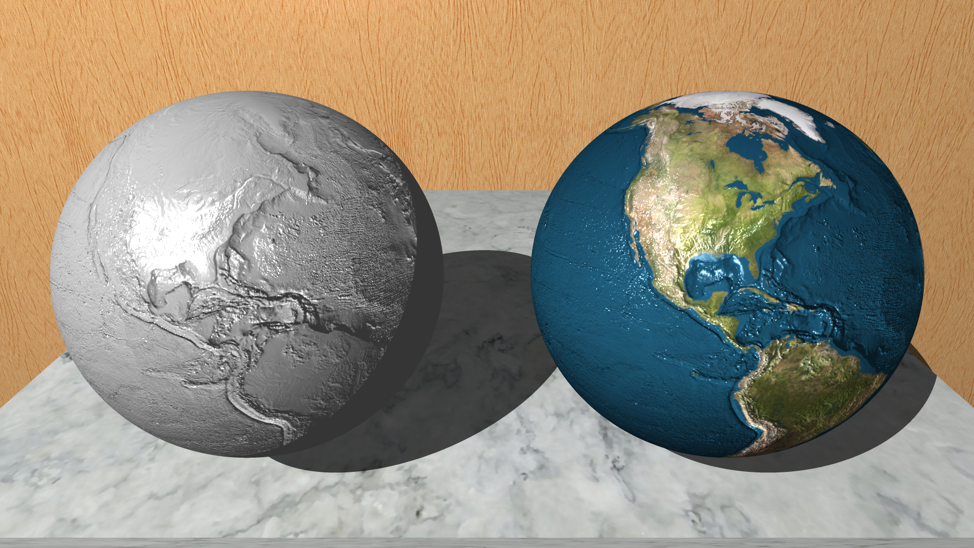 A normal map of the earth has been applied to on top of an earth texture onto a sphere. The image was rendered twice with different lighting angles to more clearly show the normal mapping.