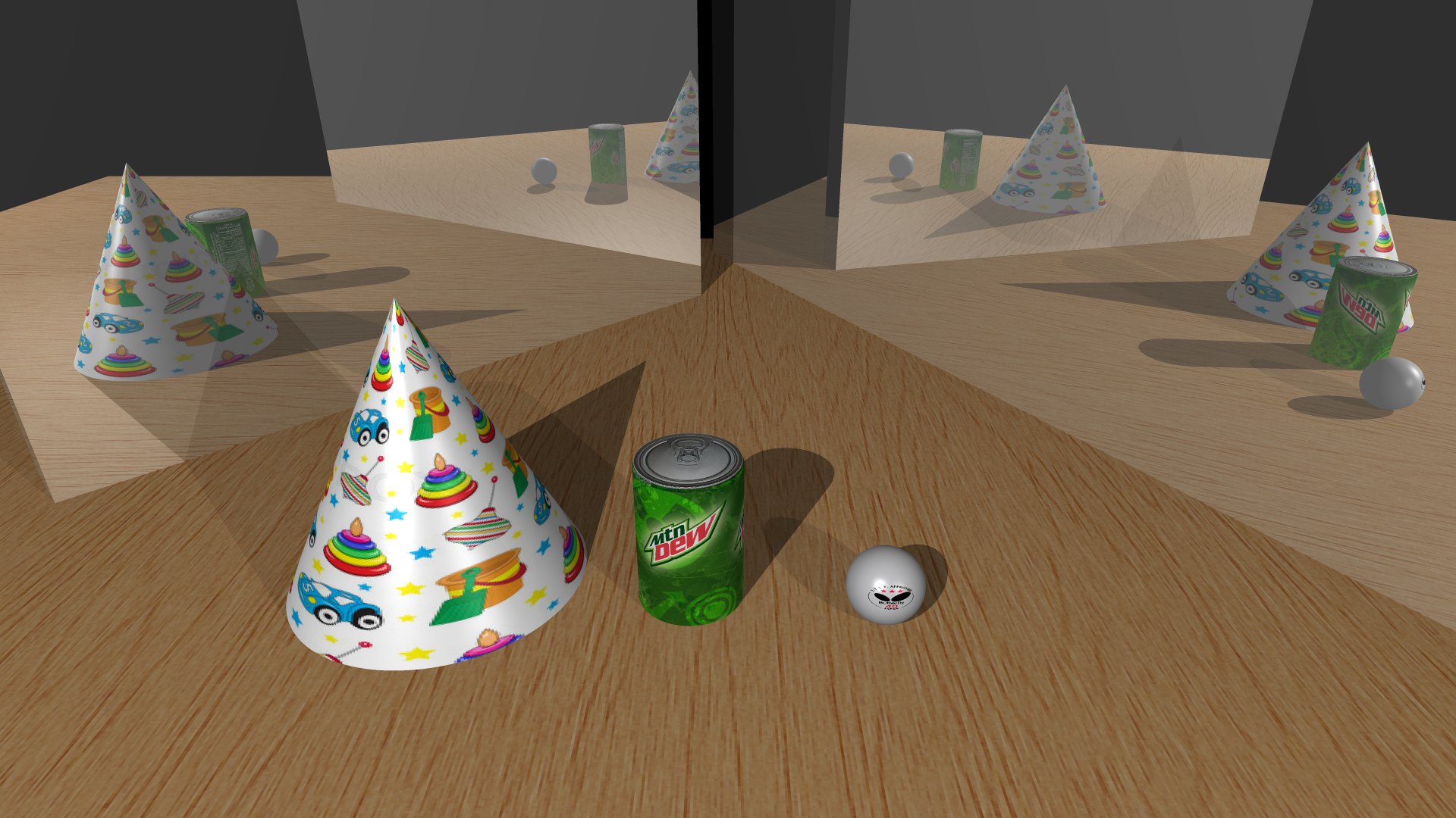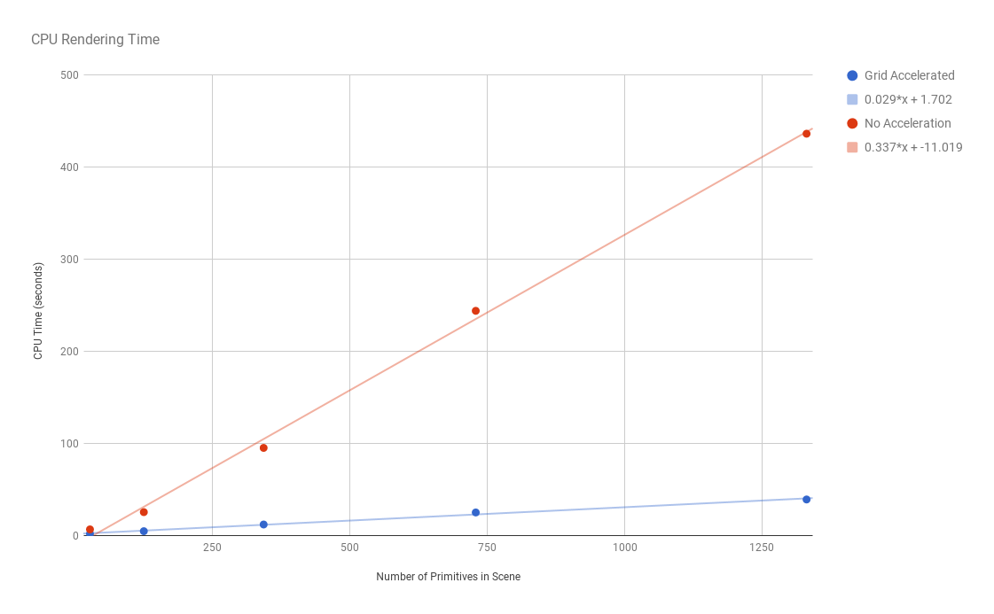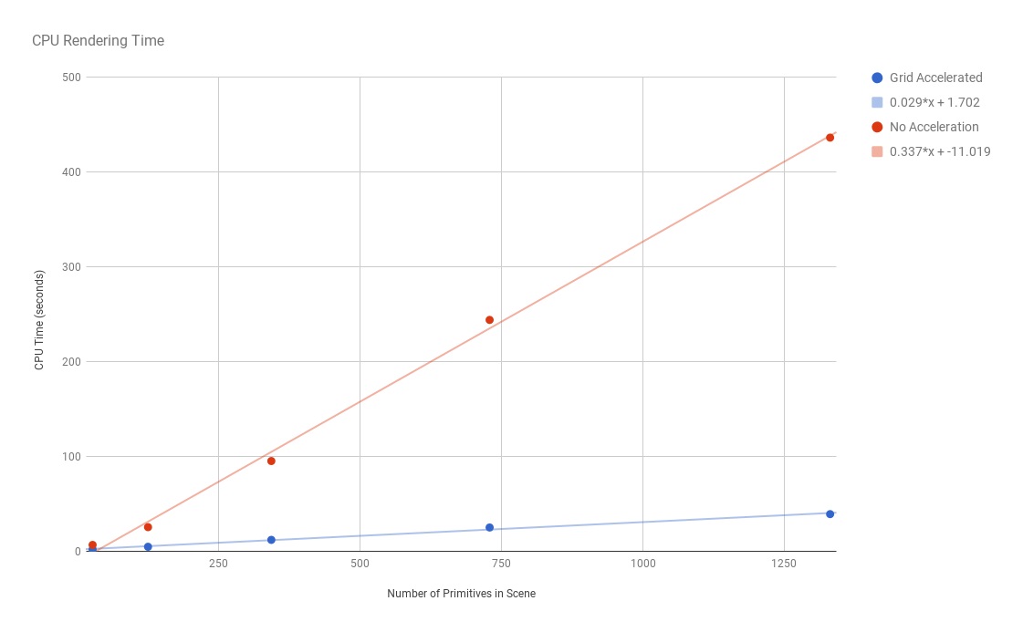Ray-object intersection calculations were accelerated by subdividing the scene into uniformly sized grids and precomputing which objects occupied which cells in the grid.
